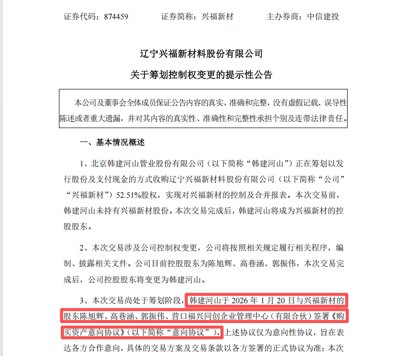 兴福新材、韩建疆土均公告称,1月20日,韩建疆土与本次来回的主要来回对方陈旭辉、高巷涵、郭振伟,以及营口福兴同创企业贬责中心(有限合股)(以下简称福兴同创)签署《购买钞票意向公约》。